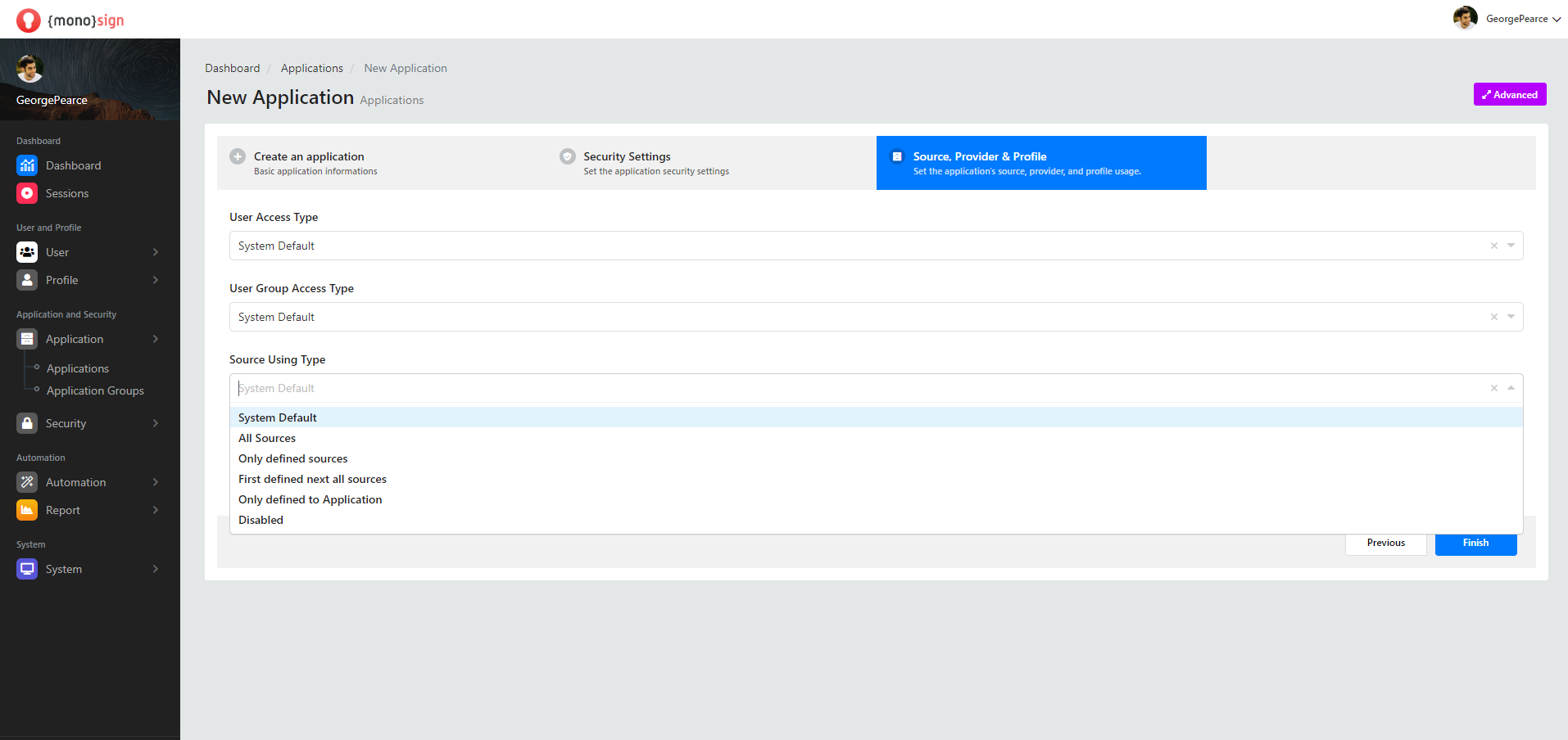 Yeni uygulama ekleme sayfasında bulunan next (ileri) ve previous (geri) butonları Create an Application (Bir Uygulama Oluştur), Security Settings (Güvenlik Ayarları) ve Source, Provider & Profile (Kaynak, Sağlayıcı ve Profil) bölümleri arasında ileri geri geçiş yapmanıza olanak sağlarlar.