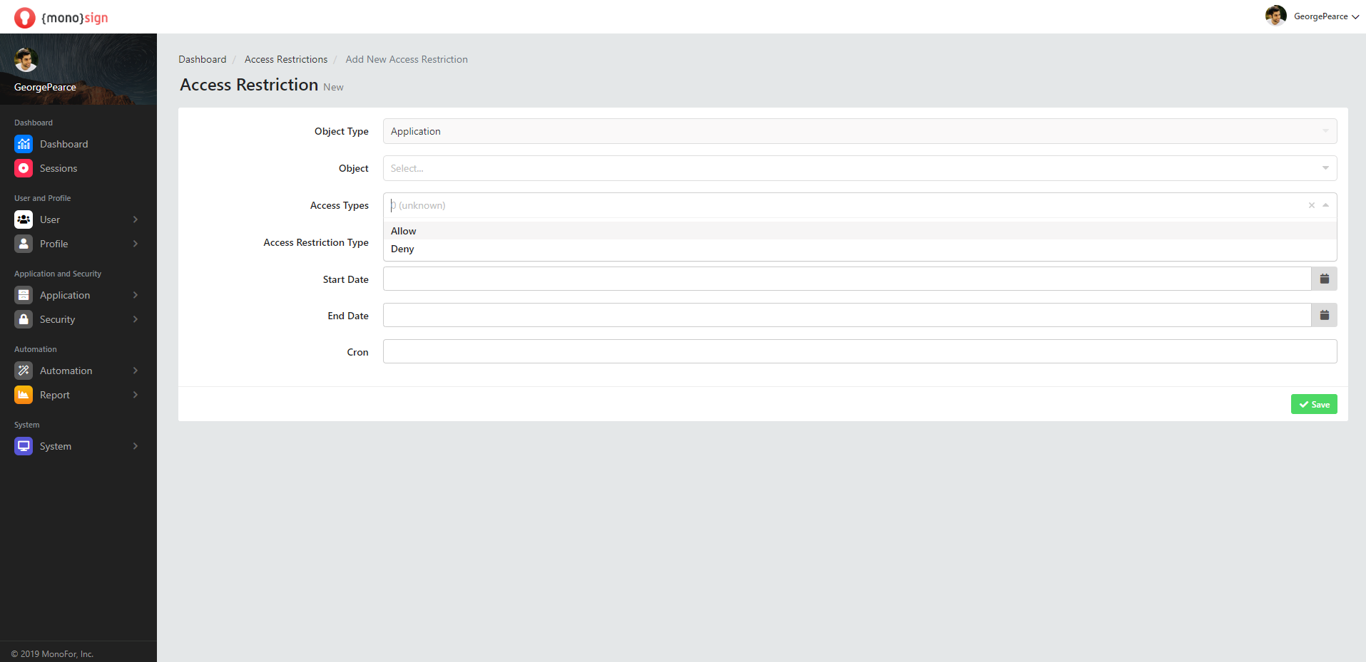 Bütün alanlar doldurulduktan ve özellikler belirlendikten sonra pencerenin sağ alt kısmında bulunan yeşil "save (kaydet)" butonuna tıklanarak yeni bir erişim kısıtlaması eklenmiş olur. İşlem başarılı bir şekilde gerçekleştiğinde karışınıza bir onay bildirimi çıkarır.